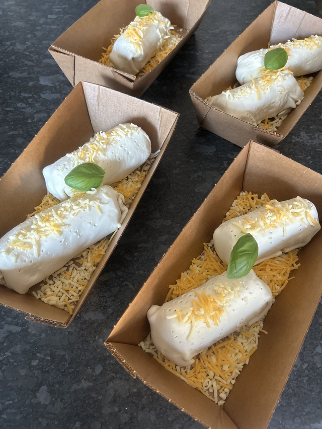 Die Dicken Reh-Bratrollen, umhüllt mit Blätterteig und gerebelten Gouda gefüllt.